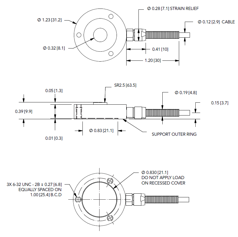 LLB400按鈕式測力傳感器 FSH03889 445 N LLB400,445 N量程,按鈕式測力傳感器,RoHS認證,#6-32安裝螺孔,材質 - 1704 PH S.S.不銹鋼,#26 AWG 4芯編織屏蔽聚四氟乙烯電纜,長度3米