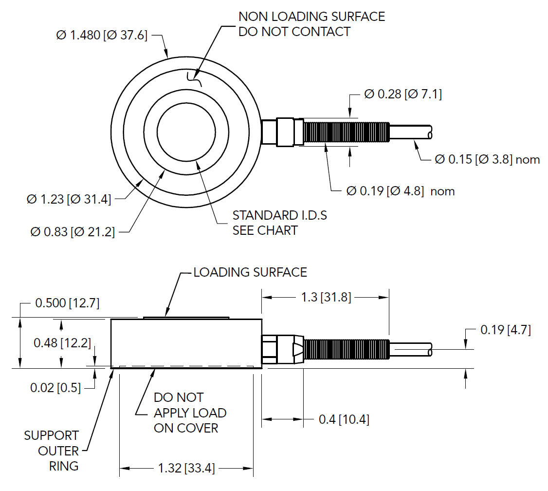 LTH350中空型測力傳感器 FSH00363 2224N 3/8" [9.53 mm]內徑 LTH350,2224 N量程,中空型/螺栓預緊力傳感器,RoHS認證,材質 - 17-4 PH S.S.不銹鋼,3/8" [9.53 mm]內徑,#24 AWG 4芯編織屏蔽聚四氟乙烯電纜,長度3米